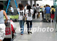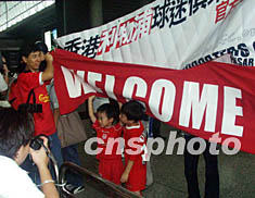 英超勁旅利物浦25日下午抵達香港國際機場,熱情球迷在機場穿上利物浦球衣及拉起橫額歡迎。作者:謝育元