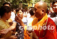北京潭柘寺二十九日隆重舉行建寺1696年慶典活動,潭柘寺方丈常道向參加慶典活動的游人點撒圣水,以祝眾生平安。中新社記者:宋吉河