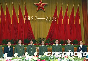 中國國防部三十一在北京舉行招待會,慶祝中國人民解放軍建軍七十六周年。中央軍委副主席曹剛川(中)、中央軍委委員廖錫龍(左二)、徐才厚(左三)、梁光烈(右三)、李繼耐(右二)出席招待會。中新社記者:鄭萍萍
