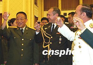 中央軍委副主席曹剛川向出席招待會的外國駐華武官敬酒。中新社記者:鄭萍萍