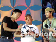 八月初,搜狐公司在北京朝陽公園舉辦“搜狐在線2.0,簡單上網新生活”大型游園會,眾多明星前來捧場。張朝陽和香港著名影星曾志偉(中)為網民簽名。中新社記者:張勤