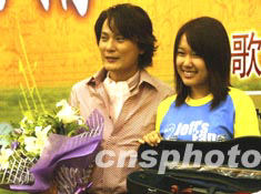 臺灣情歌王子張信哲6日亮相北京,為9月5日在北京工人體育場舉辦的“遠見名苑之夜--弦情四季”演唱會做前期準備工作,演唱會第一位購票者向張信哲贈送鮮花并得到一把小提琴的回贈。中新社記者:趙振清