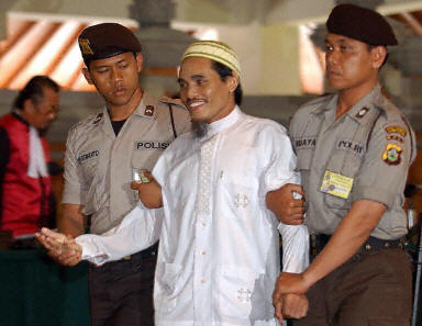 印度尼西亞一家法庭8月7日宣布一名伊斯蘭武裝分子阿姆奧茲(中)在巴厘島爆炸案中犯下的恐怖罪罪名成立,并判決他死刑。去年10月12日,印尼旅游勝地巴厘島一家夜總會發生爆炸,造成200多人死亡,330多人受傷,其中多數為外國游客。