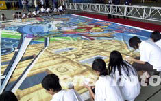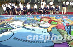 為喚起全澳市民支持本地民航業的發展,澳門國際機場專營股份有限公司在專業畫室的協助下,發起本澳小畫家繪畫的以機場為主題的大型圖畫『攜手繪出新氣象』八日舉行繪制成功儀式。中新社記者:李剛