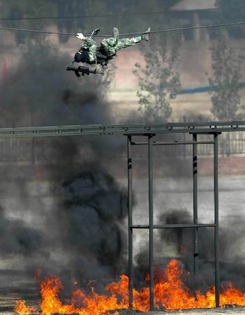 第一部分是新訓法、新戰法演練,主要進行智勇格斗、靈活駕駛、精確排爆、快速攀登、安全越障等基礎課目的演示,反恐分隊和特戰隊員們以靈敏的反應和不凡的身手,顯示了他們過硬的軍事素質。
