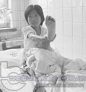 馮佳緣今年11歲,在齊齊哈爾市和平二小讀書,開學(xué)念四年級,是這次芥子毒劑桶泄露中毒事件中第35個入203醫(yī)院治療的患者。也是目前事故的第11現(xiàn)場———齊齊哈爾市第五中學(xué)現(xiàn)場惟一一個中毒者。記者在病房見到她的時候,醫(yī)生正在給她換藥、清創(chuàng)。醫(yī)生一再安慰她別怕疼。但在藥快換完的時候,馮佳緣還是沒能忍住、哭出了聲兒。換完藥后,馮佳緣告訴記者,4日晚上,她只是在5中的操場上路過,結(jié)果第二天腳起泡了,然后去住院,直到前天她看到報紙后,才轉(zhuǎn)到203醫(yī)院救治,現(xiàn)在馮佳緣的病情已稍有好轉(zhuǎn)。
