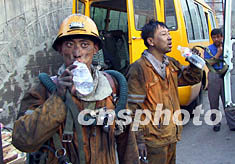 山西大同市杏兒溝煤礦第六批救護隊員在瓦斯爆炸現場連續工作十小時,搶救依然失蹤的5名礦工。13日,他們走出坑口后,第一件事就是喝水。杏兒溝煤礦“八·一一”瓦斯爆炸已造成三十七人死亡。作者:王煥偉