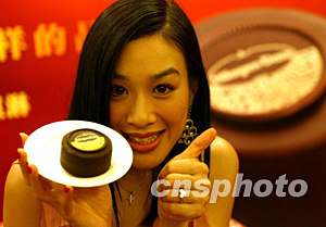 十三日晚,著名影星鐘麗緹在北京凱賓斯基飯店推介哈根達斯月餅冰淇淋。中新社記者:趙振清