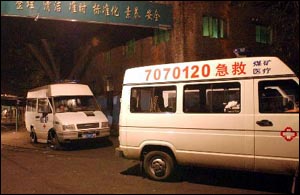 現(xiàn)場到處是救護(hù)車、警車、醫(yī)生、救護(hù)隊(duì)員。由于是國有大礦,一切救護(hù)工作都顯得井然有序。井口在一個不大的四方小院里,井口邊緣掛著燈,再往里看時,感覺到黑壓壓的很深。井口正對面的宣傳欄上,寫著“警鐘常鳴”,“實(shí)施安全生產(chǎn)法”等字樣。三礦醫(yī)院的副院長穿著白大褂,帶著20幾個醫(yī)護(hù)人員守侯在井口,據(jù)說井下還有4、5個醫(yī)護(hù)人員。據(jù)悉,到晚上22時,已經(jīng)有4批救護(hù)隊(duì)員下井勘察。