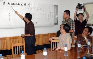 在后方指揮部的一間小會議室里,閃光燈在不停地閃爍,領(lǐng)導(dǎo)、煤礦負(fù)責(zé)人、記者,擠了滿滿的一屋人。晚上22點(diǎn)25分,山西省省委書記田成平從太原趕到陽泉,長形會議桌前,煤礦負(fù)責(zé)人正在掛在墻上的“裕公井K7210面大樣圖”前介紹煤礦和事故的基本情況。