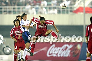 八月十七日,2003年“可口可樂”杯中國女足南北明星爭霸賽在北京舉行,雙方在比賽中爭搶異常激烈。最終,北方明星隊以4比1戰勝南方明星隊。中新社記者:盛佳鵬