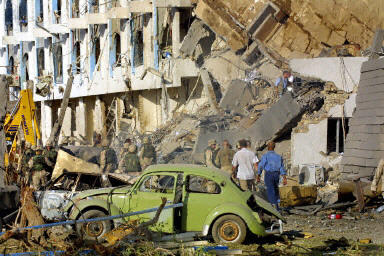 聯合國雇員告訴福克斯新聞,爆炸發生時大樓里至少還有150名工作人員。福克斯新聞記者丹-斯普林杰自現場發回的報道稱,兩層高的“運河賓館”有整整一個角被炸掉!據稱,爆炸的中心位置好象位于賓館的大廳。(章田)