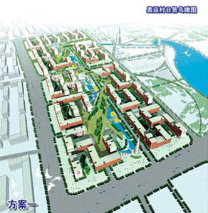 該方案將奧運村地塊劃分為18個城市街區,從東南向西北,逐漸由“鬧”到“靜”。東南方向以公建為主;西北方向布置住宅、公寓。住宅樓設計成折形板樓,形成“類四合院”的效果。