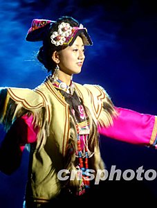 四川省九寨溝民族藝術團如今每天為當地中外游客舉行篝火晚會,羌族姑娘展示昔日游牧生活的服飾,漂亮而實用。中新社記者:賈國榮