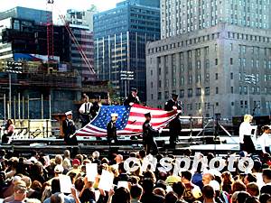 八點三十分,紀(jì)念儀式正式開始,完全不同于去年滿臺政要的場面,紐約市長布隆博格、紐約州長柏塔基以及前市長朱利安尼都只分別穿插著作了簡短的講話,其余的三個多小時全部由來自罹難者家庭的約二百名孩子輪流誦讀兩千七百九十二名罹難者名單,很多罹難者家屬在聽到親人的名字時高高舉起手中的照片。整個誦讀曾四次中斷,全場以默哀方式紀(jì)念兩座大樓被撞和倒塌的四個悲劇性時刻。