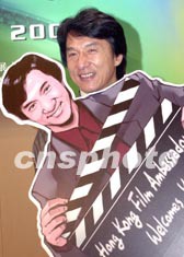 國際影星成龍9月18日在香港出席《香港國際影視展2003》記者會,「香港電影大使」成龍手抱自我漫畫人像紙牌,宣傳香港電影。作者:鄧慶樂