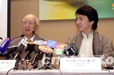 香港貿易發展局9月18日在香港舉行《香港國際影視展2003》記者會,嘉禾娛樂事業主席兼貿發局影視娛樂業咨詢委員會主席鄒文懷(左)、「香港電影大使」成龍分別于會上發言。作者:鄧慶樂