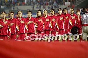 美國當地時間9月21日晚8點,中國女足參加了第四屆女足世界杯小組賽首場比賽,比賽對手是非洲勁旅加納隊,中國女足憑借老將孫雯的頭球以1比0戰勝加納隊,取得開門紅。圖為中國女足首發隊員面對國旗齊唱國歌。作者:劉占坤