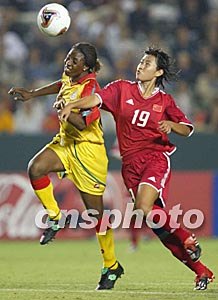 美國當地時間9月21日晚8點,中國女足參加了第四屆女足世界杯小組賽首場比賽,比賽對手是非洲勁旅加納隊,中國女足憑借老將孫雯的頭球以1比0戰勝加納隊,取得開門紅。 中國隊19號韓端與加納隊員爭頂。作者:劉占坤