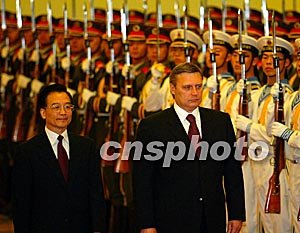 國務(wù)院總理溫家寶今天上午在人民大會堂北大廳主持儀式,歡迎出席完上海合作組織成員國總理第二次會晤的卡西亞諾夫正式訪華。