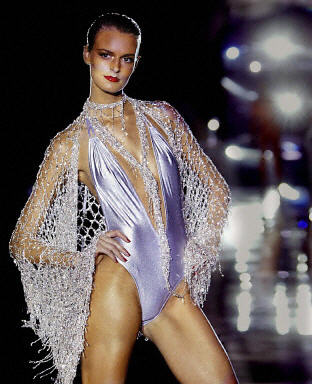 9月24日,在倫敦的2004春夏時裝周上,名模坎貝爾展示Julien Macdonald設計的新款時尚時裝,展露自己的性感身材。