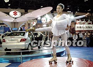 兩位雜技小演員九月二十五日在北京國際商用車展覽會中的湖北東風雪鐵龍展臺上,展示圓桌輪滑高超技藝,為愛麗舍(Elysee)X與SX型新車促銷表演。作者:鄒憲