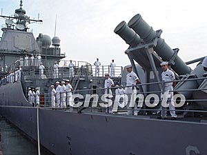 美國艦艇編隊于九月二十六日上午結束對中國南海艦隊的訪問離開湛江港。圖為美國導彈巡洋艦“考彭斯”號上的美軍在甲板上。作者:李小軍