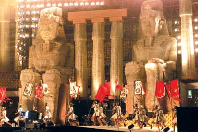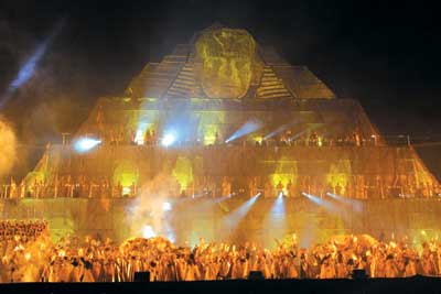夜色中,雄偉的埃及金字塔在絢麗的燈光映襯下顯得格外迷人。歡呼的人群,凱旋的勇士,齊放的禮花,昨晚工體數(shù)萬(wàn)觀(guān)眾在這里領(lǐng)略了世界上最大場(chǎng)面的演出。