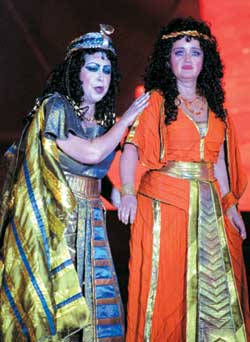 盡管專(zhuān)業(yè)氣象臺(tái)一直預(yù)報(bào)演出時(shí)無(wú)雨,但是昨天一天的天氣都十分陰沉,讓人不禁為這場(chǎng)演出捏了一把汗?墒抢咸煊醒,到了傍晚時(shí)天氣變得格外的好。當(dāng)晚八時(shí),《阿依達(dá)》在萬(wàn)眾企盼中終于熱鬧開(kāi)場(chǎng)。一陣優(yōu)美的前奏之后,美麗的埃塞俄比亞公主阿依達(dá)翩然出場(chǎng)。金字塔在絢麗燈光的映襯下,透著迷人的光暈。冰島男高音歌唱家克里斯蒂安·約翰遜扮演的男主角拉達(dá)梅斯、意大利著名男低音歌唱家佳尤蒂扮演的大祭司等劇中角色依次出場(chǎng),洪亮的嗓音和優(yōu)美的唱腔不時(shí)博得觀(guān)眾的陣陣掌聲。