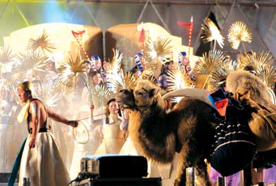 當(dāng)晚演出的高潮出現(xiàn)在第二幕第二場(chǎng)。在雄壯有力的凱旋進(jìn)行曲聲中,兩千名由武警戰(zhàn)士扮演的身穿戰(zhàn)袍的勇士邁著整齊的步伐走過(guò)這個(gè)世界上最大的舞臺(tái),上千名歡慶勝利的群眾在舞臺(tái)上載歌載舞,而繳獲的戰(zhàn)利品——駱駝、老虎、獅子等動(dòng)物明星們的出場(chǎng)以及在體育場(chǎng)看臺(tái)四周齊放的絢麗的煙花更增添了歡慶的節(jié)日氣氛。這時(shí),工人體育場(chǎng)一下子沸騰了,觀(guān)眾們被眼前盛大的場(chǎng)景深深感染了,臺(tái)上臺(tái)下歡呼聲響成一片,首屆北京國(guó)際戲劇演出季掀起了第一個(gè)高潮。