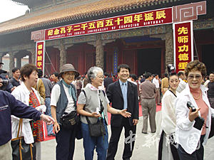 孔廟大成殿前懸掛著的“紀(jì)念孔子兩千五百五十四年誕辰”橫幅和“先師功德垂青史,儒學(xué)精華照五洲”的對聯(lián),表達(dá)出海峽兩岸孔子后裔及海內(nèi)外儒學(xué)信仰者的共同心愿。孔子第七十七代嫡孫孔德懋受在海峽彼岸臺灣的孔德成先生的委托,與家人一起來到大成殿前,祭拜祖先。眾多海內(nèi)外孔子后裔與來自印尼、韓國、馬來西亞、美國、香港、臺灣、澳門等十多個國家和地區(qū)的祭孔參禮團(tuán)的數(shù)百名來賓祭拜了“至圣先師”——孔子。