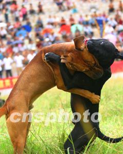 國慶佳節期間,貴州省凱里市由康偉經貿發展公司舉辦的首屆東方斗牛大賽上,斗狗比賽異常激烈。中新社記者:宋吉河