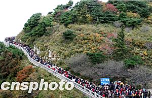 “十一”長假期間,山東泰山風景區游客如云。圖為泰山頂上等候空中纜車的數百米長龍。中新社記者:王麗南