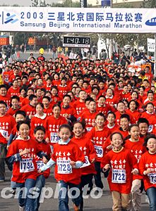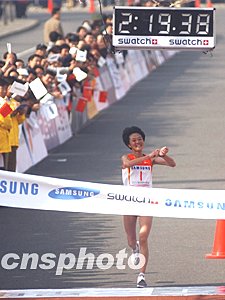 前不久在法國(guó)巴黎世界田徑錦標(biāo)賽上取得一枚銅牌的孫英杰是二00三年三星北京國(guó)際馬拉松賽女子組唯一的奪冠“大熱門”。在比賽過程中,孫英杰始終處于領(lǐng)跑的第一集團(tuán)之中,并于后半程脫穎而出,最終以二小時(shí)十九分三十九秒的成績(jī)輕松奪得女子組冠軍,創(chuàng)造北京國(guó)際馬拉松賽女子組歷史最好成績(jī)。