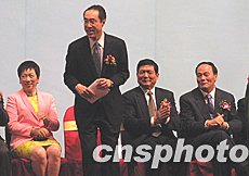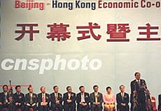 第七屆北京·香港經濟合作研討洽談會二十三日在北京飯店舉行開幕儀式,香港特別行政區政府財政司司長唐英年(左二)致辭表示:北京與香港通過CEPA的合作將使雙方呈現“雙龍出!敝畡。中新社記者:廖文靜
