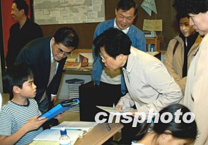 國務院僑務辦公室主任陳玉杰(中)率團赴麻省劍橋市考察當地中文學校教學情況。圖為她關切地向正在上中文課的九歲華裔男童何頌志(左)要考試試卷。中新社記者:陳建
