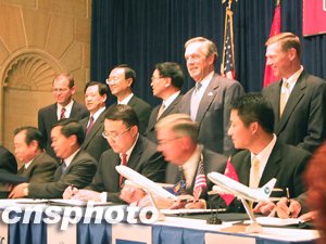 中新網華盛頓11月13日電(記者余東暉)中國與美國于美國時間十二日分別在華盛頓和底特律簽署了三個大宗采購合同,總價值超過六十億美元。