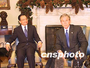 布什與溫家寶在白宮共同會見記者,指繼續保持兩國強有力關系。中新社記者 余東暉 攝