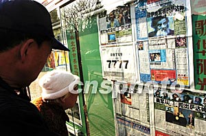 伊拉克前總統(tǒng)薩達(dá)姆被捕消息十二月十五日成為北京多家報紙的頭版頭條新聞,并以大篇幅予以報道。圖為北京市民在街頭《北京青年報》欄,逐條逐句認(rèn)真閱讀該項新聞。中新社記者:鄒憲