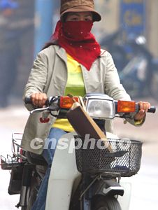 越南河內市騎摩托車的女性大都用口罩或紗錦遮口掩面,以防避陽光和灰塵。摩托車是該市市民出行的主要交通工具。中新社記者:宋吉河