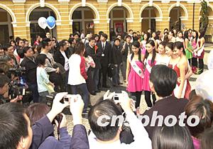 《2004年度國際華裔小姐競選》二十一位候選佳麗三十一日到澳門作一天親善訪問,圖為佳麗們?cè)谑姓䦶d留影。作者:李剛