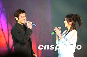 中國600多名藝術家十一日歡聚北京,在中國文聯舉辦的《百花迎春--中國文學藝術界2004春節大聯歡》上慶祝即將來臨的新春佳節,演員趙薇、陸毅同臺演唱《好人好夢》。中新社記者:王瑤