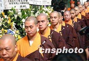 一代歌后梅艷芳元月十二日在香港殯儀館舉殯,圖為眾僧侶參加梅艷芳舉殯。作者:錢興強(qiáng)