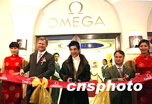 瑞士著名手表品牌歐米茄旗艦店1月13日在北京東方君悅酒店商業(yè)區(qū)開(kāi)業(yè),歐米茄中國(guó)及香港區(qū)副總裁盧克勤先生(左二)與歐米茄形象大使任賢齊(中)到場(chǎng)剪彩。中新社記者:趙振清