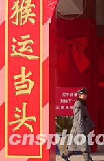 圖:北京商家打出“猴運當頭”賀歲標語