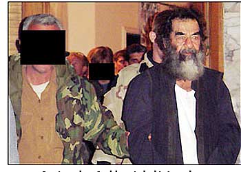 中新網1月14日電 據英國太陽報報道,薩達姆被捕后曾被一幫喜氣洋洋的美國特種部隊兵領著,帶回到他從前的宮殿。在這組具有歷史意義的新拍攝圖片中,這個滿頭蓬亂的伊拉克前總統,身著一件白色的T恤衫,外套一件黑色的羊毛大衣,雙手被塑料手銬銬著。