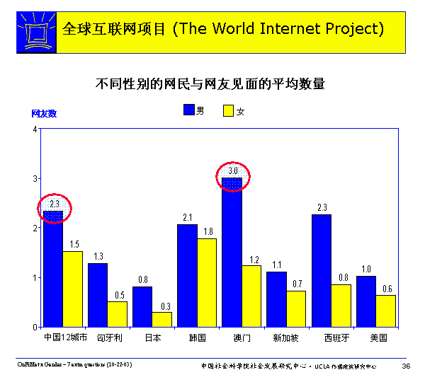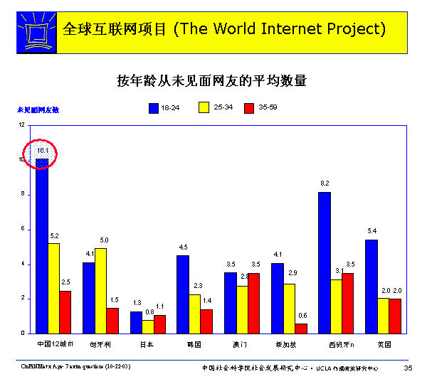 不同國家的網民中從未和網友見面的人的比例也不相同。在這方面,中國網民中從未和網友見面的人數最高,達到了7.7%,而日本則最低(1.1)。當然,這還需要參照各國網民實際在網上交友的數量進行比較研究。