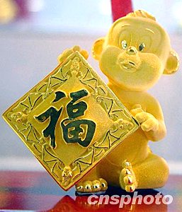 2004年1月17日,安徽省淮北市一家珠寶首飾店內(nèi)一尊尊純金打造栩栩如生的“金猴”,準備在春節(jié)黃金周期間,吸引消費者選購。猴年將至,猴金飾品日益成為人們的新寵。謝正義 攝