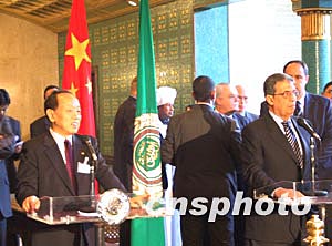 中國外長李肇星與穆薩三十日在開羅舉行記者會,宣布中國和阿拉伯國家合作論壇(中阿合作論壇)自即日起正式成立,中阿雙邊并發表了《中國——阿拉伯國家合作論壇宣言》。中新社記者:齊彬