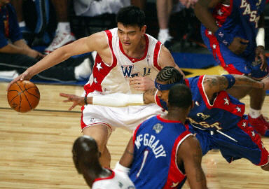 中新網(wǎng)2月16日電 北京時間今天上午,NBA全明星賽在美國西部城市洛杉磯進行。中國球員姚明繼去年以狀元秀的身份入選2003年全明星賽事的西部首發(fā)陣容后,今年再次代表巨星云集的西部球隊出戰(zhàn)。本場比賽,西部全明星隊136-132擊敗東部全明星隊,姚明在比賽中表現(xiàn)出色,上場19分鐘,貢獻16分,4個籃板和1次助攻,得分在所有球員中排名第五。